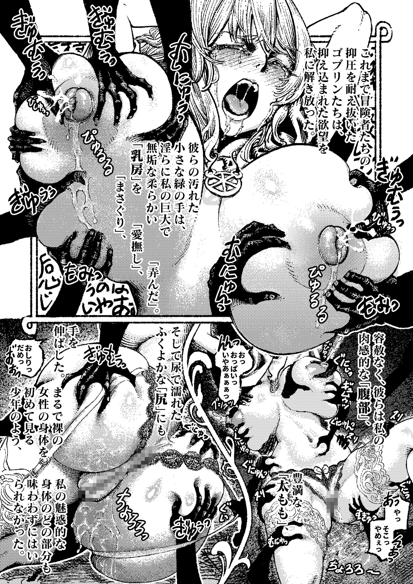 ゴブリンたちは彼女を陵〇し、ファーストキスを奪い、乳を吸い、輪〇し、処女を奪い、全身の7つの穴で○す。